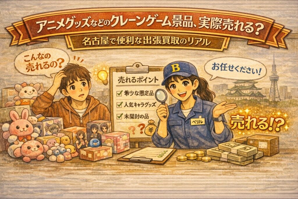 この記事では、アニメグッズなどのクレーンゲーム景品は実際に売れるのかという基本から、売れやすい景品の傾向、逆に売れにくいケース、名古屋で出張買取が便利と言われる理由、そして査定前にやっておきたい簡単な準備まで、分かりやすくまとめていきます。「景品が増えて困っている」「捨てるのはもったいない」「できれば手間をかけずに整理したい」という方は、ぜひ最後までチェックしてみてください。思っていた以上に、景品整理が前に進めやすくなるはずです。