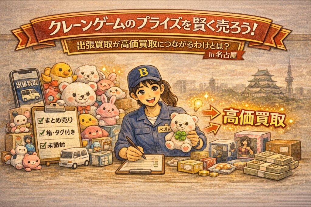 この記事では、名古屋でUFOキャッチャー景品を賢く売るために、出張買取が高価買取につながりやすい理由を分かりやすく整理しつつ、売れやすい景品の特徴、10分でできる準備、依頼前に確認したい注意点までまとめます。「捨てるのはもったいないけど、フリマはしんどい…」という方こそ、ぜひ参考にしてください。
