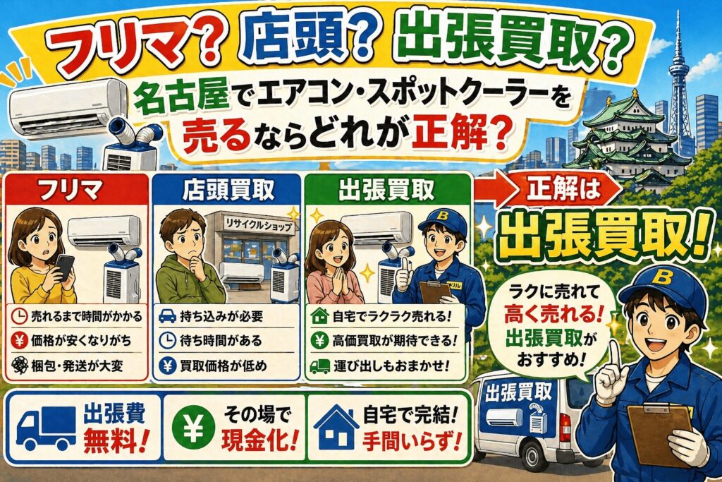 この記事では、「フリマ?店頭?出張買取?名古屋でエアコン・スポットクーラーを売るならどれが正解?」というテーマで、それぞれの売却方法の違い、エアコンやスポットクーラーならではの注意点、出張買取が向いているケース、高く売るための準備、依頼前に確認したいポイントまでを分かりやすく整理していきます。名古屋でエアコンやスポットクーラーをできるだけラクに、そして納得感を持って手放したい方は、ぜひ参考にしてみてください。