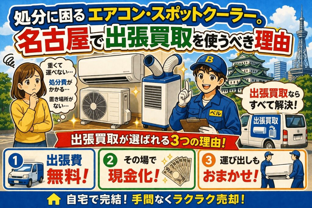 この記事では、「処分に困るエアコン・スポットクーラー。名古屋で出張買取を使うべき理由」というテーマで、エアコンやスポットクーラーが処分しにくい理由、売れる可能性があるケース、出張買取が向いている理由、高く売るための準備、依頼前に確認しておきたいポイントまでを分かりやすく整理していきます。名古屋市で使わなくなった冷房機器の整理に困っている方は、処分する前にぜひ参考にしてみてください。