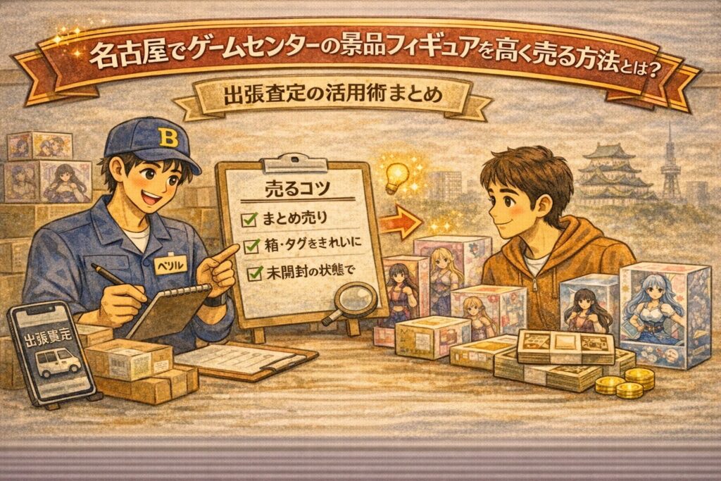 この記事では、「名古屋でゲームセンターの景品フィギュアを高く売る方法」をテーマに、景品フィギュアが売れやすい理由や高価買取につながりやすいポイント、出張査定の活用術、査定前にやっておきたい準備、注意点まで、初めての方にも分かりやすくまとめていきます。フリマアプリや店舗買取と比べて何が違うのかも整理しながら、なるべく手間をかけず、でも損を減らしながら売るための考え方を紹介していきます。