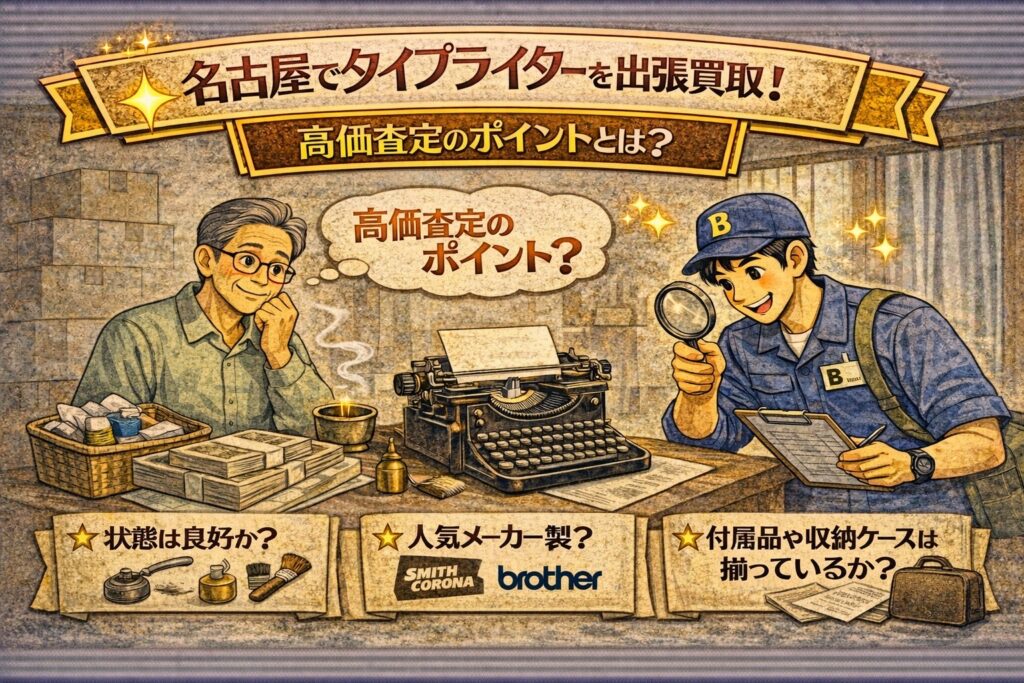この記事では、「名古屋でタイプライターを出張買取に出すなら、どこが見られやすいのか」を分かりやすく整理します。磨きすぎや分解など、やり方を間違えると逆効果になりやすいポイントもあるため、査定前にやるべきこと・やらなくていいことを含めて、高価査定につながりやすい“準備”をまとめました。