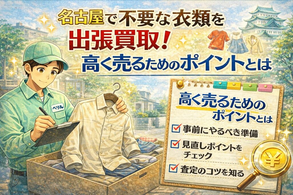 この記事では、名古屋で不要な衣類を出張買取に出す際にできるだけ高く売るためのポイントを分かりやすく解説します。事前準備の考え方や、出張買取ならではのコツを知っておくことで、納得感のある衣類整理につなげることができます。