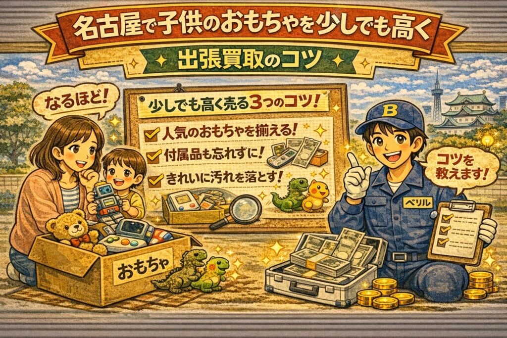 この記事では、「名古屋で子供のおもちゃを少しでも高く売るには?出張買取のコツ」というテーマで、おもちゃが売れやすい理由、フリマ・店頭・出張買取の違い、出張買取が高く売ることと相性がよい理由、査定前にやっておきたい整理のコツ、出張買取を使いやすい家庭の特徴、依頼前に知っておきたいことまでをわかりやすく整理していきます。名古屋で使わなくなった子供のおもちゃを、できるだけ無理なく、そして少しでも納得感を持って整理したい方は、ぜひ参考にしてみてください。