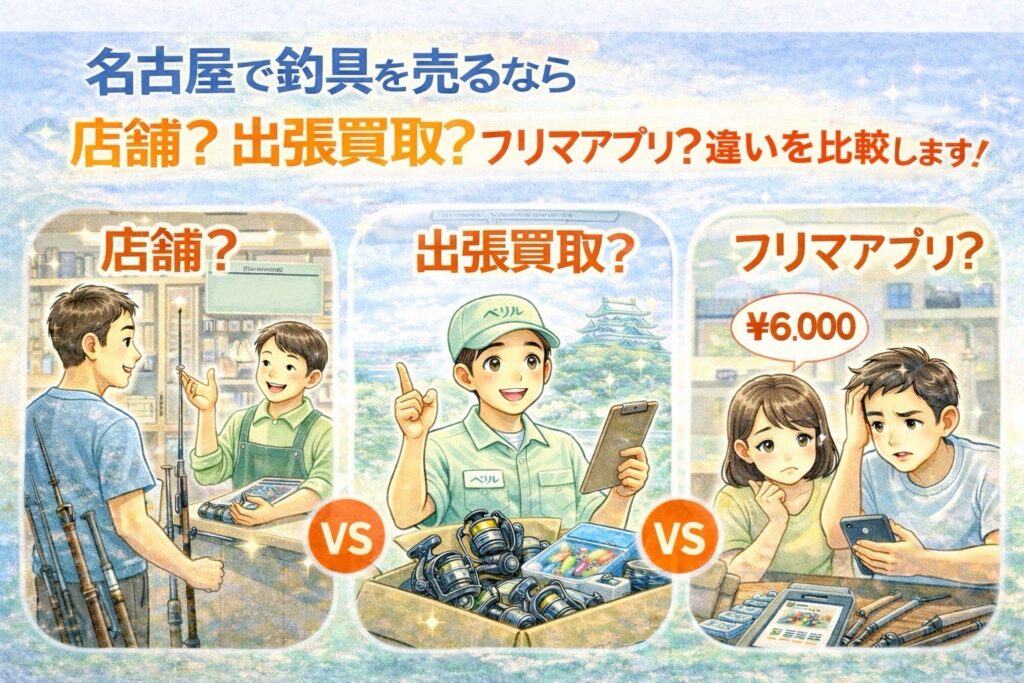 そこでこの記事では、名古屋で釣具を売る「店舗買取」「出張買取」「フリマアプリ」の3つを、メリット・デメリットだけでなく、手間・スピード・価格の伸びやすさ・トラブルリスク・向いている人まで具体的に比較します。さらに、ロッド/リール/ルアー/大型アイテム(クーラーボックス・魚探等)といったアイテム別に「どの売り方が有利か」も整理し、最後に迷ったときの結論(選び方の早見表)も用意しました。