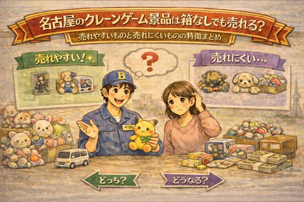 このブログでは、名古屋でクレーンゲーム景品を整理したい方に向けて、「売れやすいもの」と「売れにくいもの」の特徴を分かりやすく整理していきます。さらに、少しでも査定がスムーズになる準備や、箱なし景品に向いている売り方の考え方もまとめていきます。なんとなく「箱なしだからもう無理」と決めつけてしまう前に、一度ポイントを整理してみるだけでも、景品整理はかなり進めやすくなります。