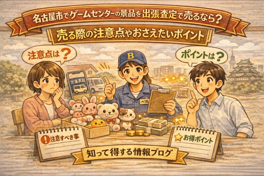 このブログでは、名古屋市でゲームセンター景品を出張査定で売るときに損しないための注意点と、査定がスムーズになりやすいおさえたいポイントを、初心者目線で分かりやすく整理します。特に「箱なし・タグなしでも相談できる?」「汚れやにおいが気になる物はどうする?」「大量だけど仕分けが終わってない…」といった“あるある不安”も含めて、出張査定を上手に使うコツをまとめました。読み終わるころには、景品整理が止まりにくい“進め方”が見えてくるはずです。