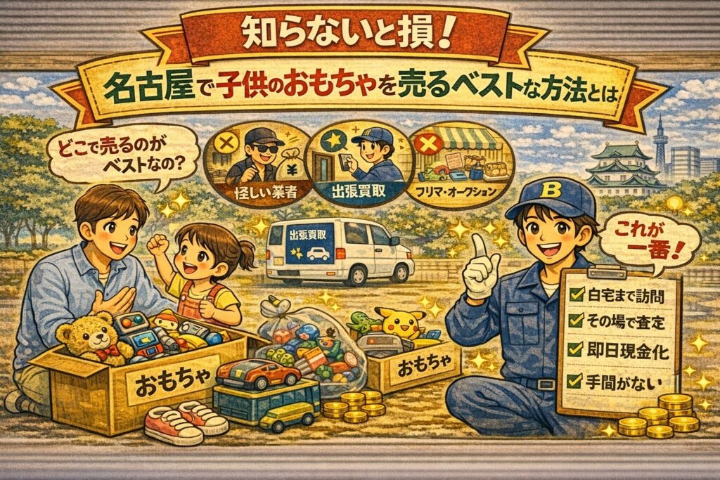 子供のおもちゃを売ろうと思ったとき、まず迷いやすいのが「結局どの方法が自分に合っているのか」という点です。特に名古屋のように、店頭買取に持ち込みやすそうな環境もあり、フリマアプリも日常的に使いやすく、さらに出張買取のような選択肢もある地域では、方法が多いぶん迷いやすくなります。しかも、子供のおもちゃは洋服や本とは違って、大きい物・細かい物・シリーズ物・知育玩具・キャラクター物などが混ざりやすく、単純に「高く売れそうな方法」を選べばよいわけではありません。