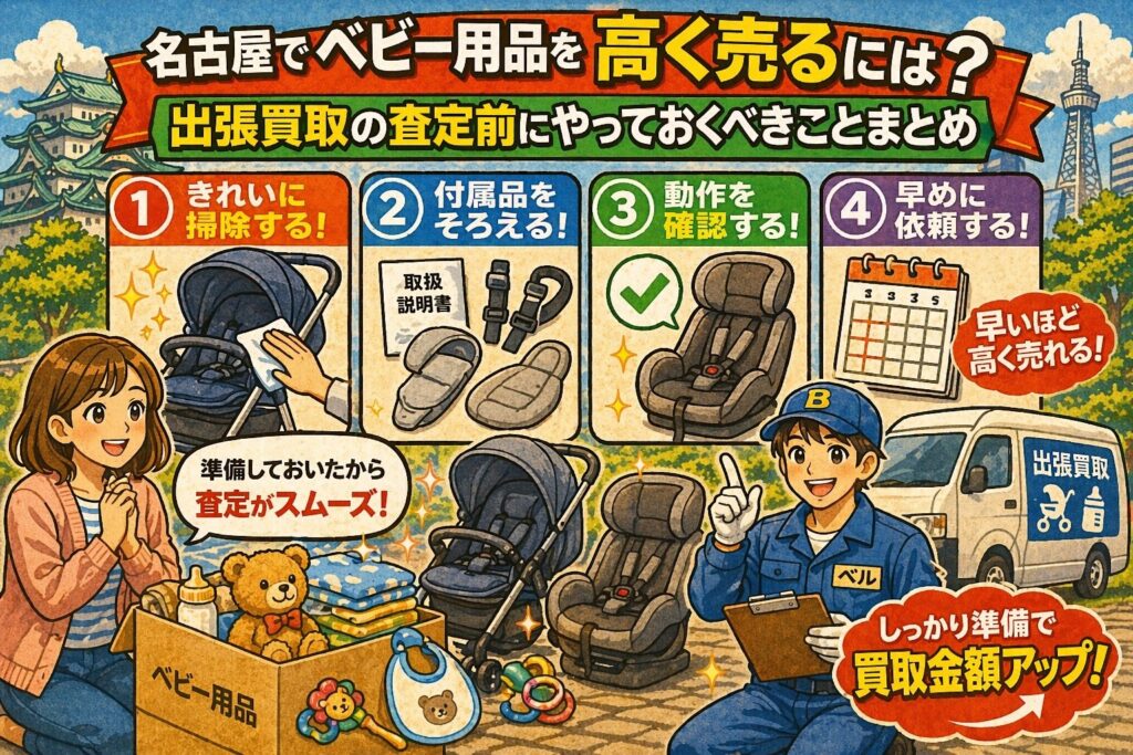 この記事では、「名古屋でベビー用品を高く売るには?出張買取の査定前にやっておくべきことまとめ」というテーマで、まずベビー用品が売れやすい理由を整理しながら、どんな売り方があるのか、なぜ出張買取と相性がよいのか、そして査定前にやっておくべき具体的な準備を順番に分かりやすくまとめていきます。名古屋で使わなくなったベビー用品を、できるだけ無理なく、そして少しでも納得感を持って手放したい方は、ぜひ参考にしてみてください。