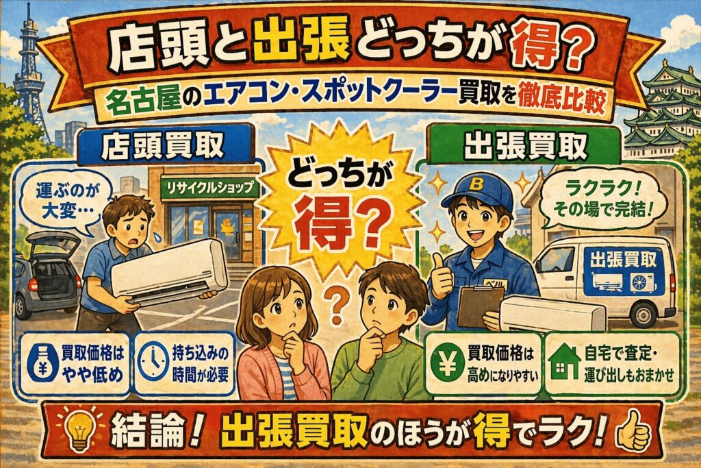 そこでこの記事では、「店頭と出張どっちが得?名古屋のエアコン・スポットクーラー買取を徹底比較」というテーマで、まずエアコンやスポットクーラーが売れやすい理由を整理したうえで、店頭買取と出張買取の違い、それぞれのメリット・負担、どんな人にどちらが向いているのか、少しでも納得して売るための準備までを分かりやすく解説していきます。査定額だけに目を向けるのではなく、“総合的に見てどちらが得か”を知りたい方にとって、判断しやすい内容にしていきますので、名古屋でエアコンやスポットクーラーの整理を考えている方はぜひ参考にしてみてください。